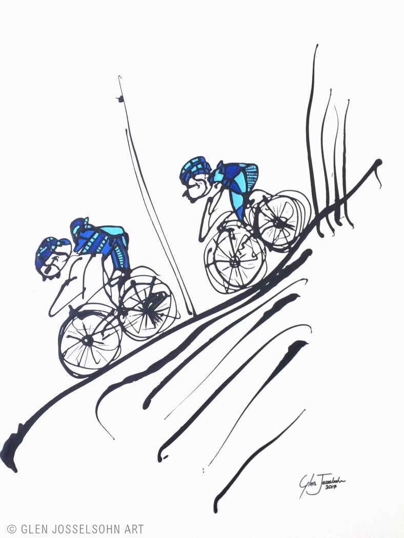 Two cyclists race downward with exhilarating speed. The drip strokes cascade like gravity itself, pulling the eye into their rapid descent.