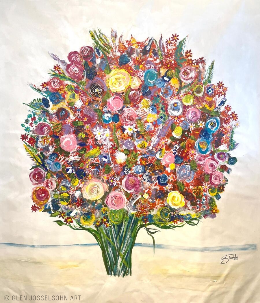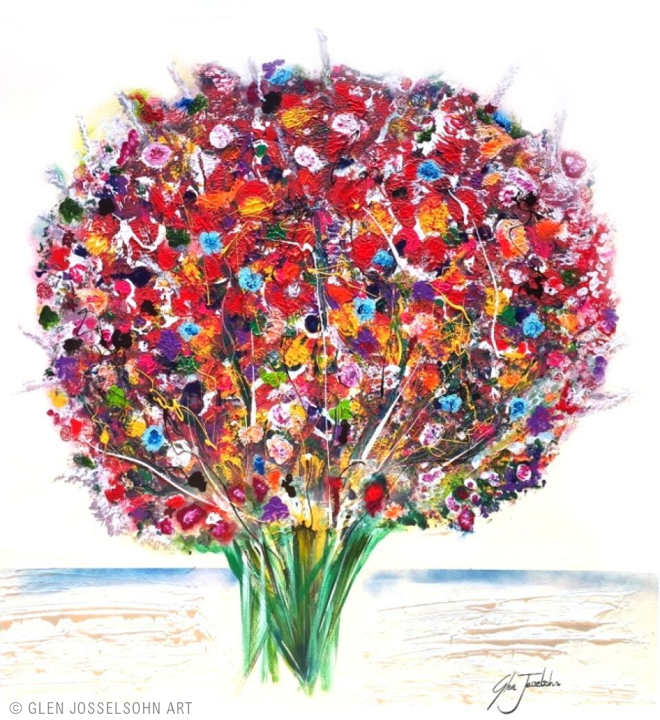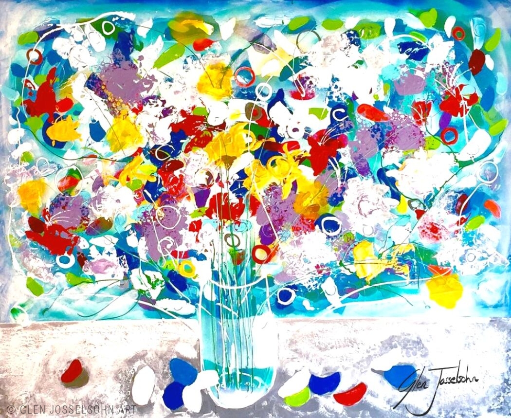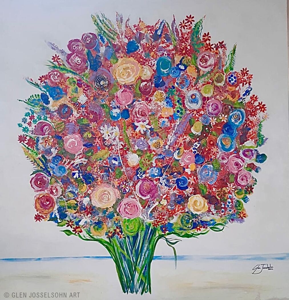 An explosion of color, texture, and life—Glen Josselsohn’s floral abstractions are created with rich layers of acrylic, bold palettes, and intricate detailing. Each bouquet radiates vibrancy and emotion, transforming the timeless beauty of flowers into a powerful contemporary statement.Every floral piece may be commissioned as a bespoke creation, hand-painted on the canvas size that perfectly suits your space.