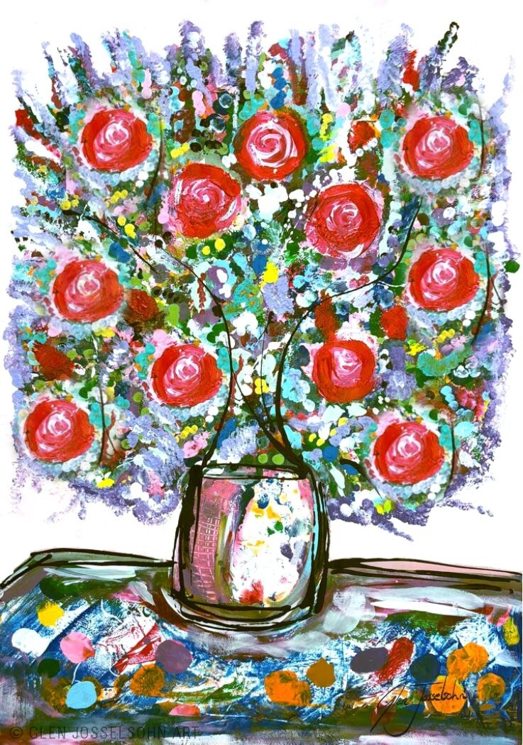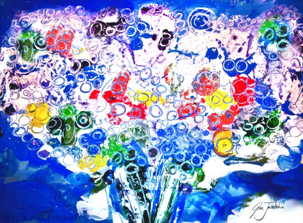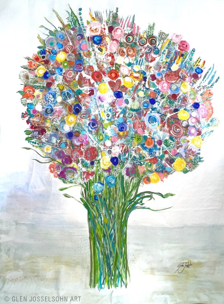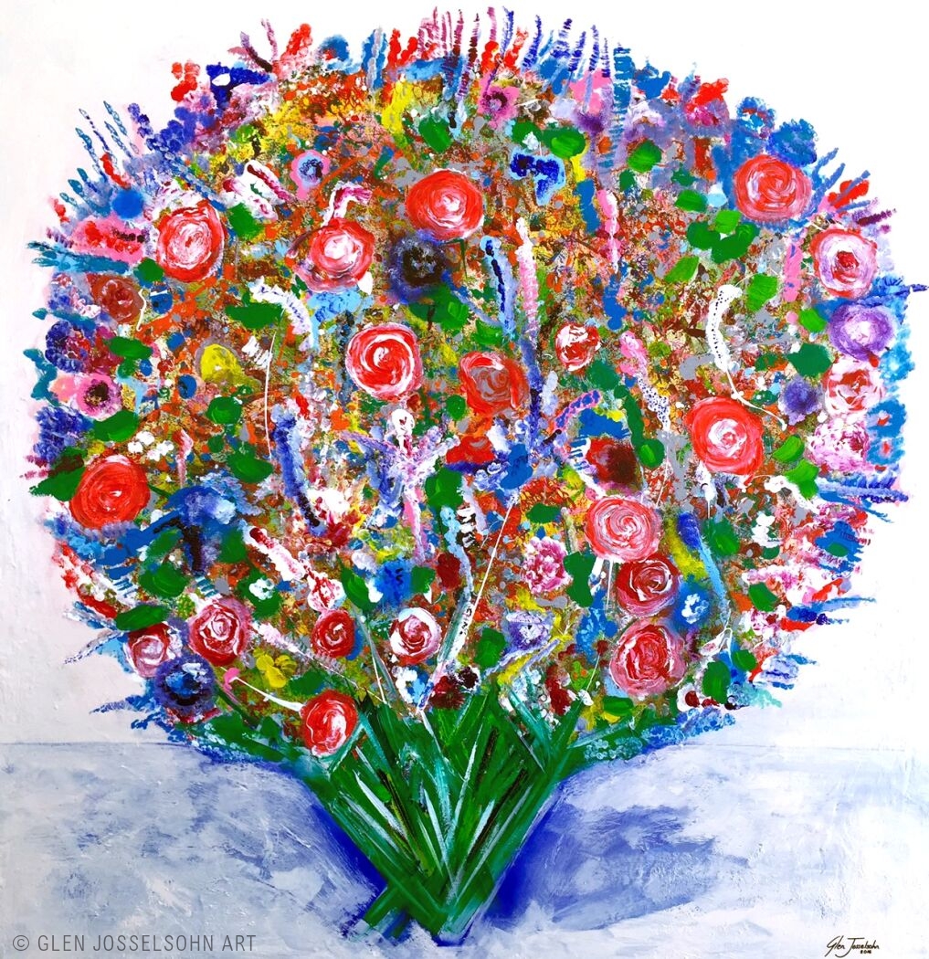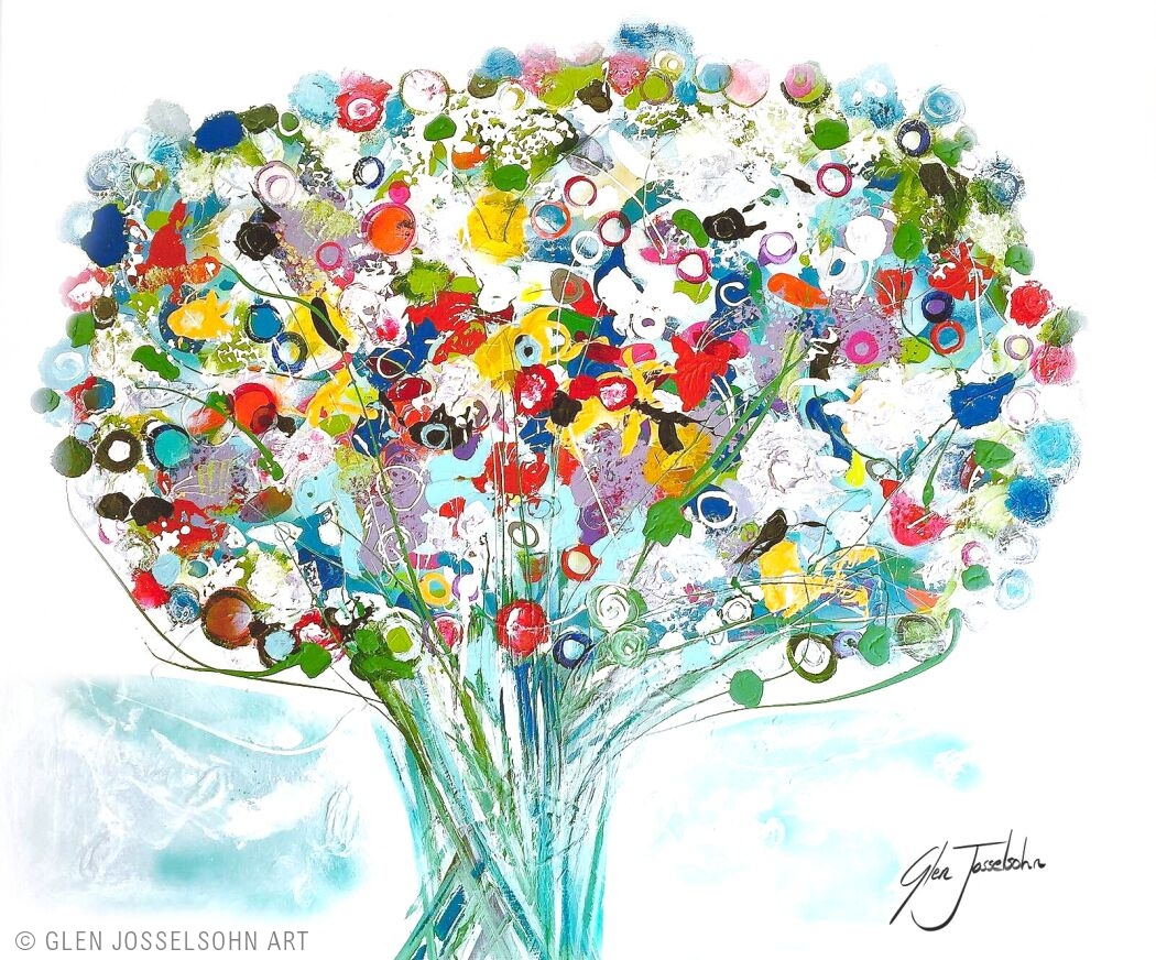 An explosion of color, texture, and life—Glen Josselsohn’s floral abstractions are created with rich layers of acrylic, bold palettes, and intricate detailing. Each bouquet radiates vibrancy and emotion, transforming the timeless beauty of flowers into a powerful contemporary statement.Every floral piece may be commissioned as a bespoke creation, hand-painted on the canvas size that perfectly suits your space.