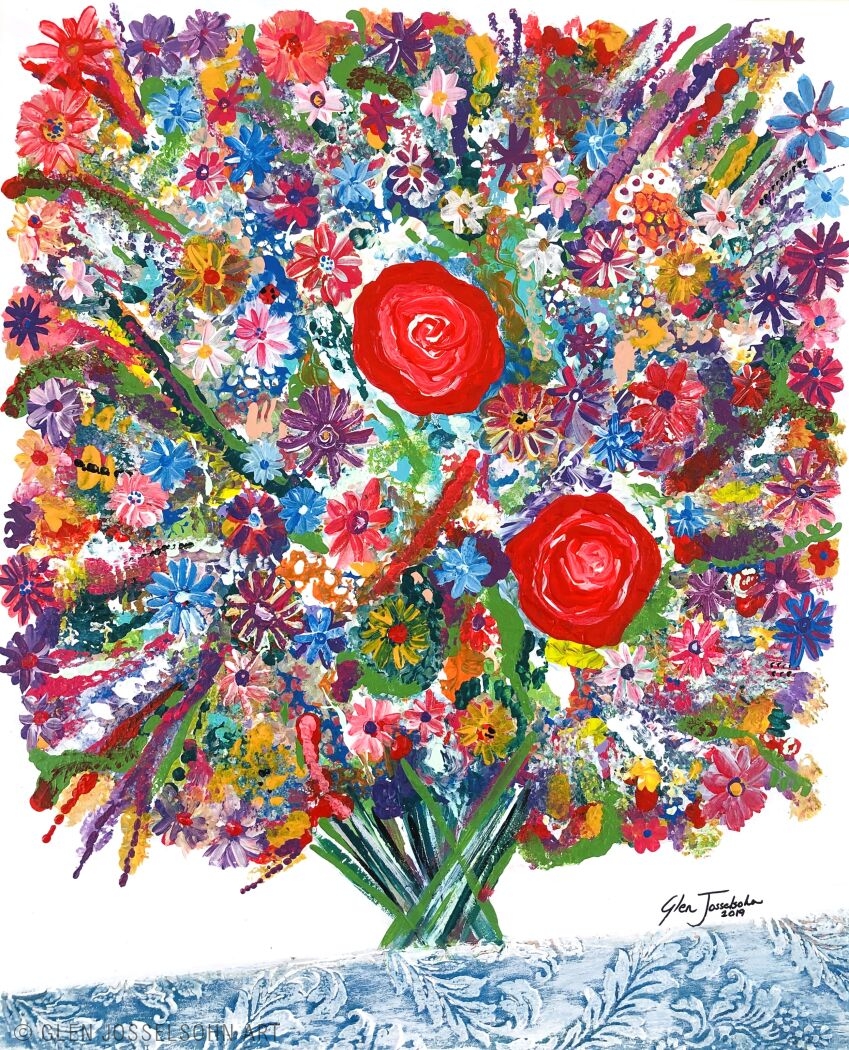 A whimsical bouquet rises with energy and joy. Vibrant drips of acrylics play across the surface, reminding us of life’s beauty in even its most abstract forms.
